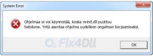 Voit ratkaista ongelman nopeasti suosittelemalla lataamista ja käyttöä nvinit.dll Fix Tool. Jos sinulla on teknistä kokemusta ja haluat asentaa DLL-tiedoston manuaalisesti, valitse Windows-versiosi ja lataa nvinit.dll, kopioi sen jälkeen oikeaan paikkaan alla olevien ohjeiden avulla, se korjaa dll-virheet.