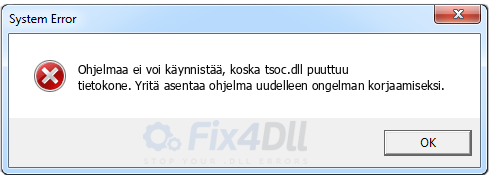 Voit ratkaista ongelman nopeasti suosittelemalla lataamista ja käyttöä tsoc.dll Fix Tool. Jos sinulla on teknistä kokemusta ja haluat asentaa DLL-tiedoston manuaalisesti, valitse Windows-versiosi ja lataa tsoc.dll, kopioi sen jälkeen oikeaan paikkaan alla olevien ohjeiden avulla, se korjaa dll-virheet.